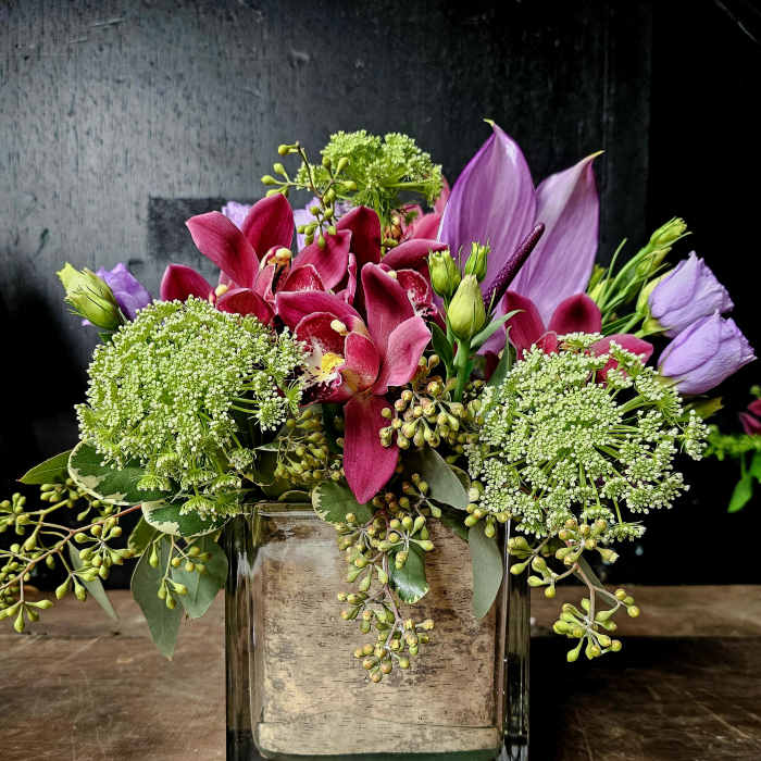 Price: $89.99Vibrant Cymbidium Orchid & Queen Anne's Lace in Glass Vase
